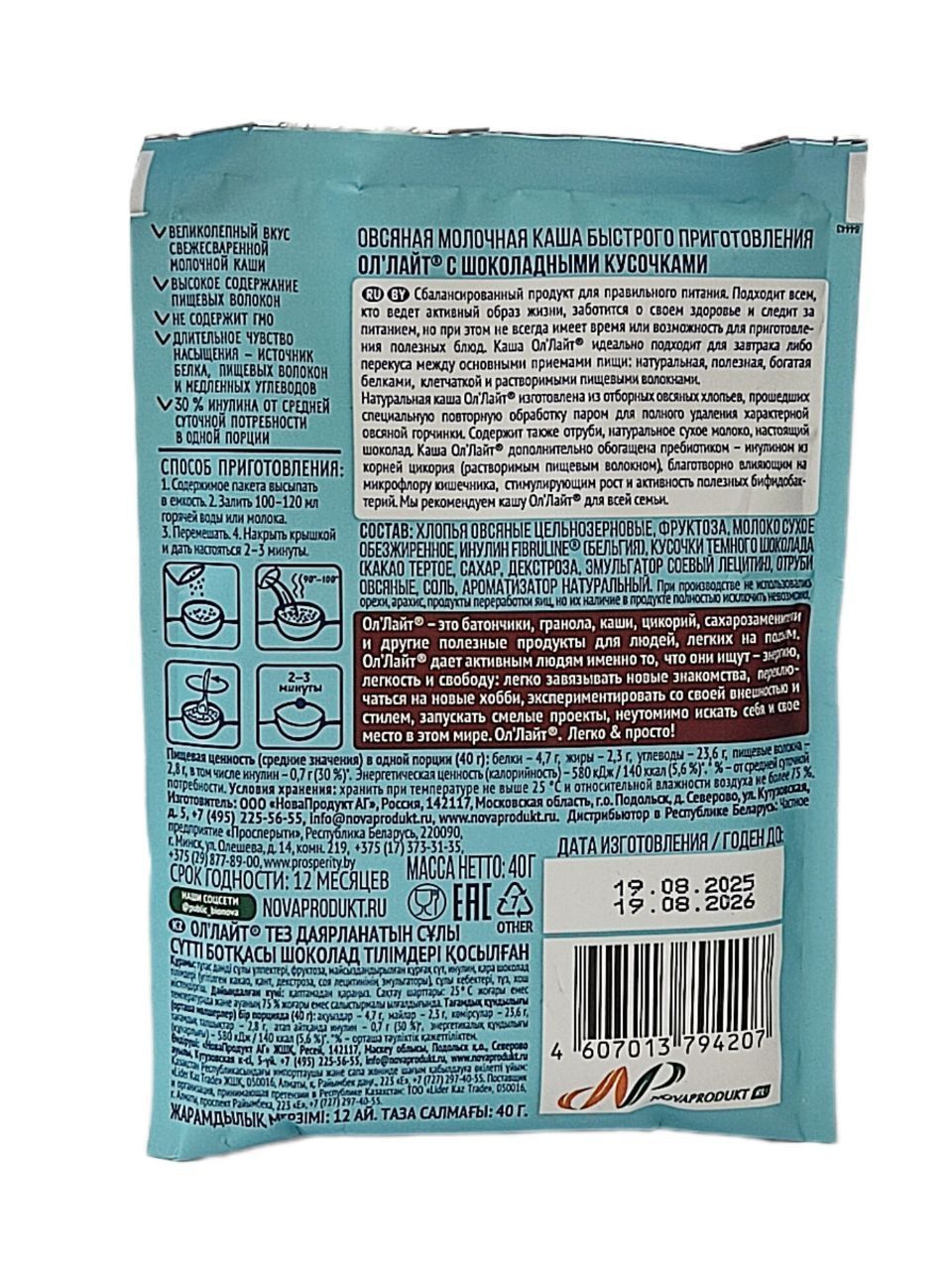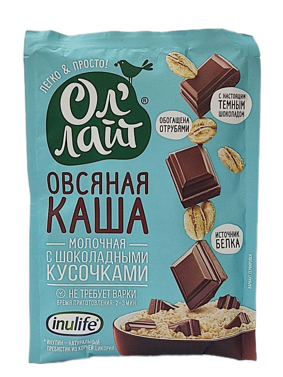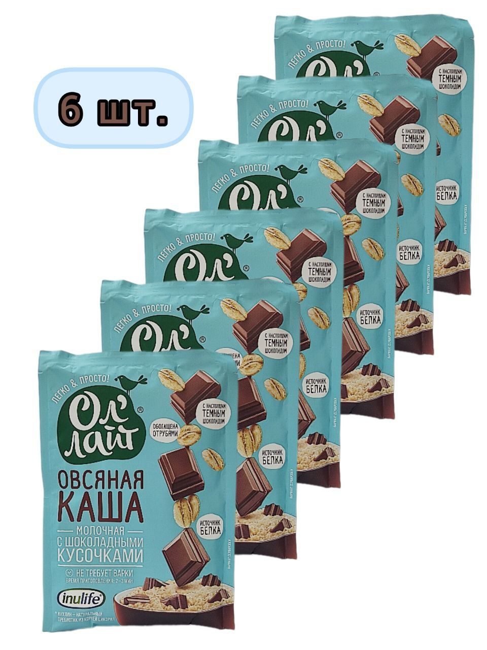 Сбалансированная овсяная каша Ол'Лайт с шоколадными кусочками содержит медленные (правильные) углеводы и пищевые волокна, в том числе инулин, поэтому она надолго придает чувство сытости, наполняя организм энергией и поддерживая аминокислотный баланс на протяжении длительного периода времени.