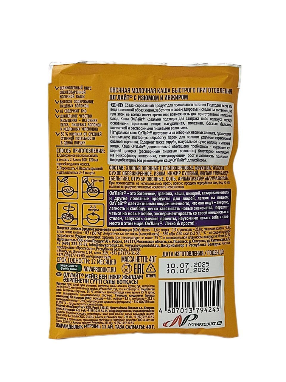 Сбалансированная овсяная каша Ол'Лайт с изюмом и инжиром без добавления сахара, содержит медленные (правильные) углеводы и пищевые волокна, в том числе инулин, поэтому она надолго придает чувство сытости, наполняя организм энергией и поддерживая аминокислотный баланс на протяжении длительного периода времени.