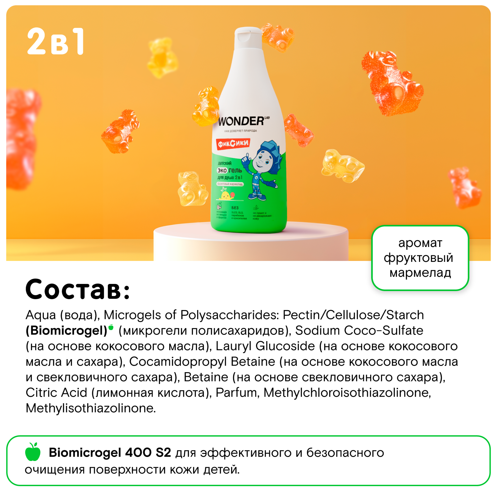 Aqua (вода), Microgels of Polysaccharides: Pectin/Cellulose/Starch (Biomicrogel®)*(микрогели полисахаридов), Lauryl Glucoside (на основе кокосового масла и сахара), Sodium Coco-Sulfate (на основе кокосового масла), Cocamidopropyl Betaine (на основе кокосового масла и свекловичного сахара), Sodium benzoate (пищевой консервант), Potassium Sorbate (пищевой консервант), Citric Acid (лимонная кислота), Saccharide Isomerate (на основе кукурузного сахара), Parfum.