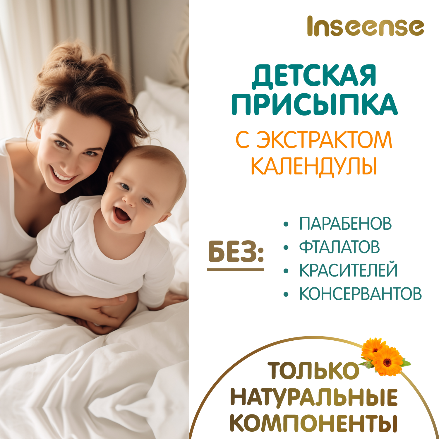 Детская присыпка Inseense с экстрактом календулы - незаменимый помощник в уходе за чувствительной кожей малыша. Уникальная формула присыпки помогает избежать раздражения и опрелостей при использовании подгузников.