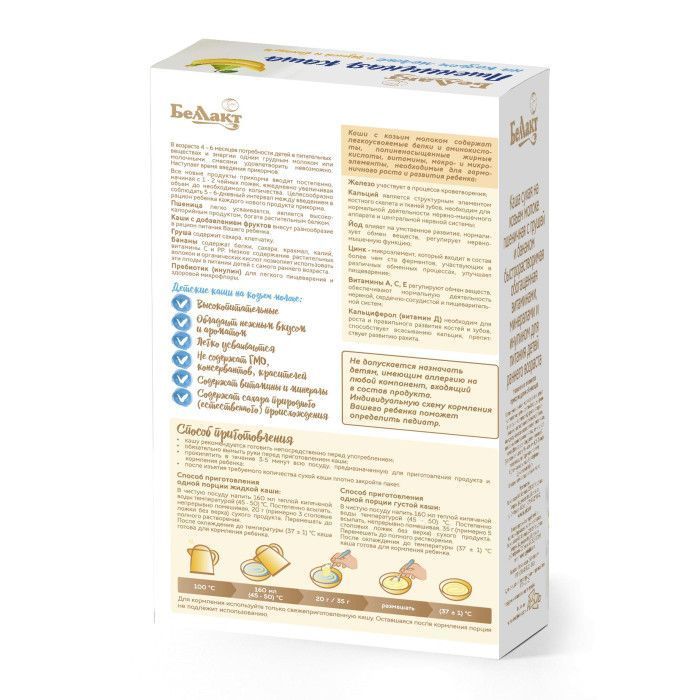 Состав: Мука пшеничная; молоко сухое козье цельное; мальтодекстрин; инулин; фруктовый порошок «Груша» (пюре груши, мальтодекстрин); фруктовый порошок «Банан» (концентрат бананового сока; пюре банана; мальтодекстрин); масло высокоолеиновое подсолнечное; минеральные вещества: кальция хлорид, цинка сульфат, железа(III) пирофосфат, йодит калия; витамины: С (L-аскорбиновая кислота), РР (никотинамид), Е (DL-альфа токоферола ацетат), А (ретинола пальмитат), В1 (тиамина гидрохлорид), В2 (рибофлавин), Д3 (холекальциферол). Возможно наличие следов коровьего молока. В наборе 2 упаковки.