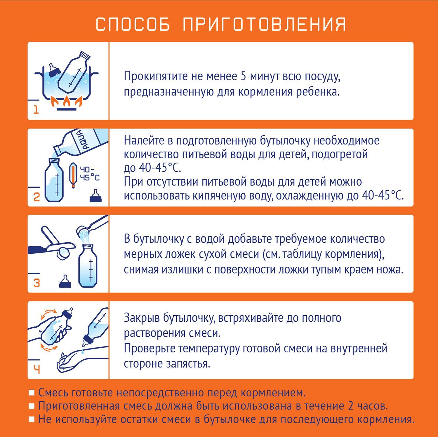 Закрыв бутылочку, встряхивайте до полного растворения смеси. Проверьте температуру готовой смеси на внутренней стороне запястья.