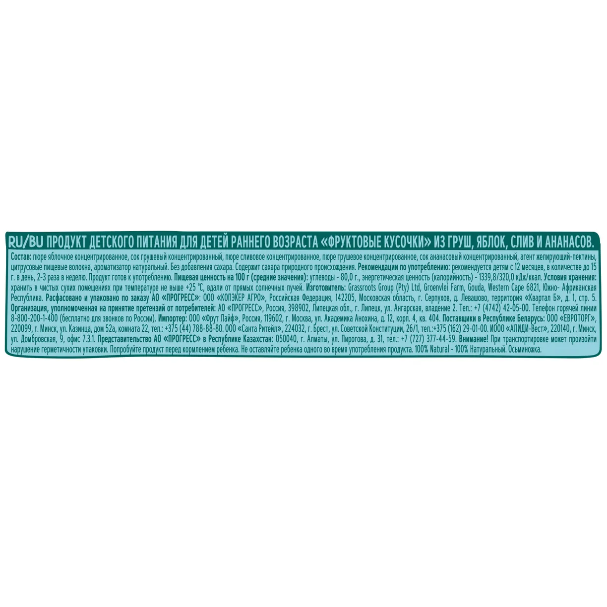 Тип: Продукт детского питания для детей раннего возраста «Фруктовые кусочки» из груш, яблок, слив и ананасов. Осьминожка.