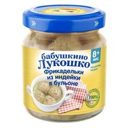 Детское пюре Бабушкино Лукошко, Фрикадельки из Индейки в бульоне, для детей с 8 месяцев, вес 100 грамм.