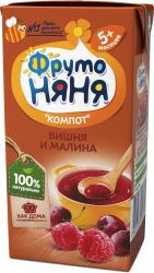 Напиток вишнево-малиновый сокосодержащий "компот" для питания детей раннего возраста "Традиционный рецепт приготовления напитков ""ФрутоНяня"" делает их такими же вкусными, как дома. Напитки, приготовленные из натуральных ингредиентов, обеспечивают вашего малыша природной пользой и энергией, необходимой для гармоничного роста. Бережная технология приготовления сохраняет природную пользу фруктов и ягод. Современное производство соответствует высоким стандартам безопасности и качества.
