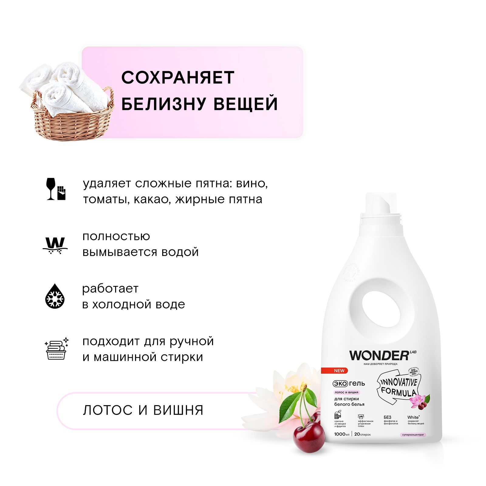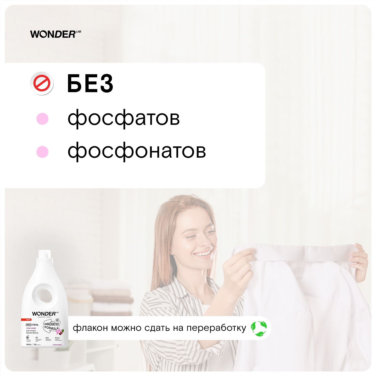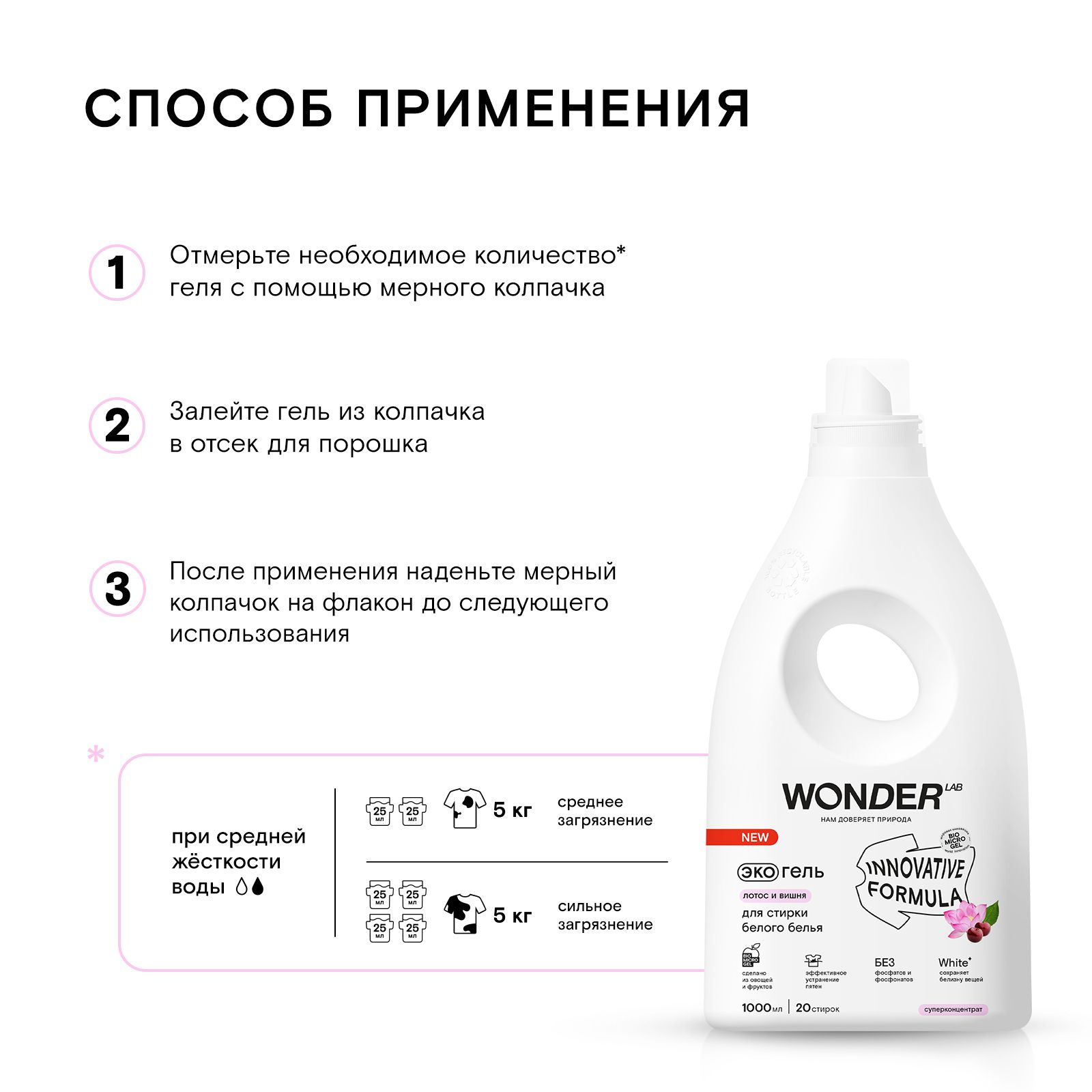 Средства для стирки WONDER LAB эффективны при температуре от 20 до 90 градусов, удаляя пятна и сильные загрязнения. Гель сохраняет первоначальную белизну вещей. Подходит для ручной и машинной стирки, не требует использования кондиционеров, сохраняя мягкость белья надолго. Легкий аромат практически не остается на одежде, благодаря чему средство для стирки отлично подойдет аллергикам и чувствительным к лишним запахам людям. экосредства не вредят водоёмам. Гель для стирки не содержит фосфаты и фосфонаты.