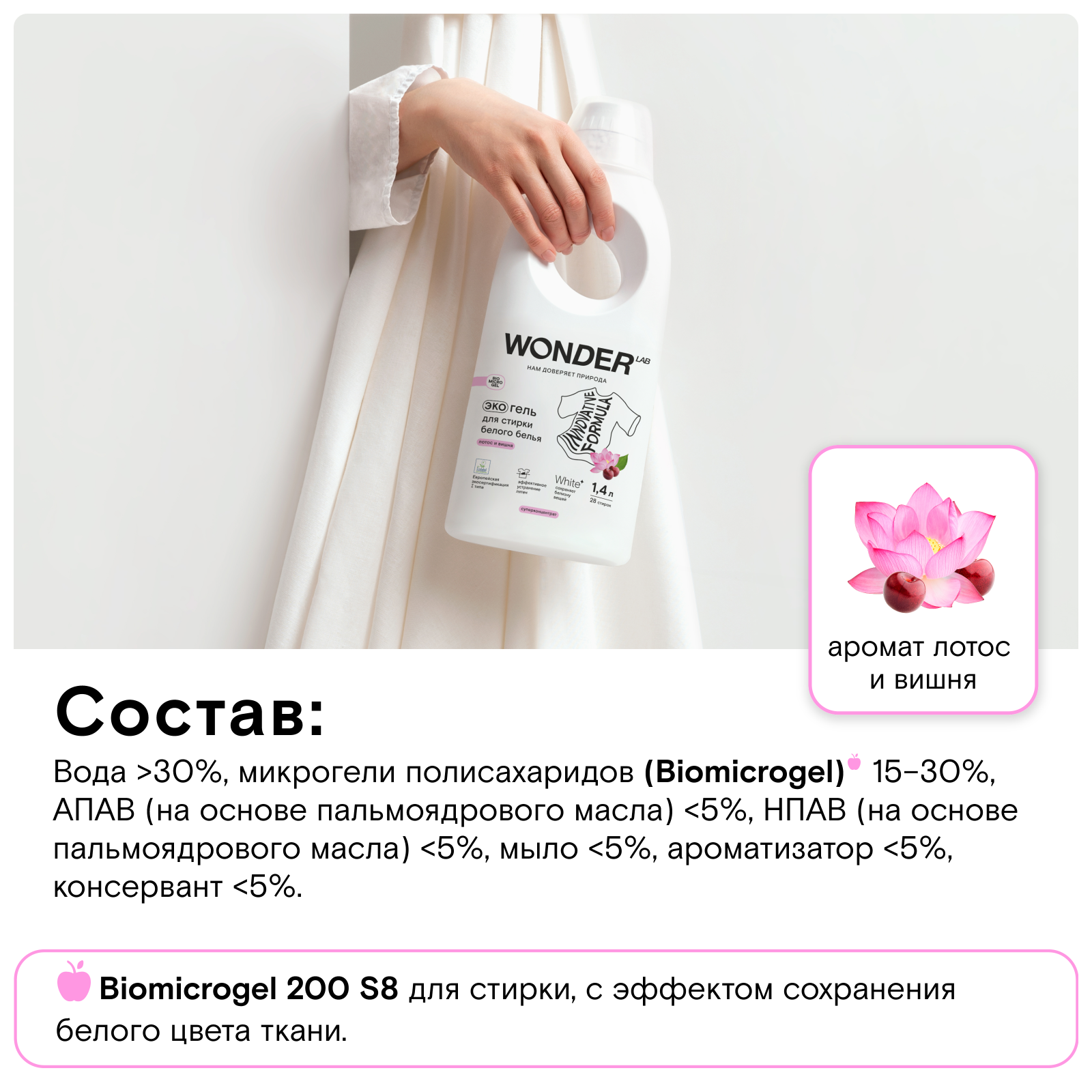 Средства для стирки WONDER LAB эффективны при температуре от 20 до 90 градусов, удаляя пятна, желтинзу и сильные загрязнения. Гель сохраняет первоначальную белизну вещей. Подходит для ручной и машинной стирки, не требует использования кондиционеров, сохраняя мягкость белья надолго. Легкий аромат практически не остается на одежде, благодаря чему средство для стирки отлично подойдет аллергикам и чувствительным к лишним запахам людям. экосредства не вредят водоёмам. Гель для стирки не содержит фосфаты и фосфонаты.
