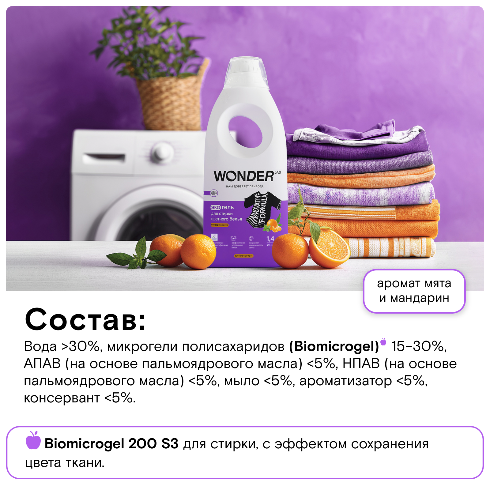 Гели для стирки и другие экосредства WONDER LAB не содержат токсичных компонентов, опасных для природы или человека. И всё это благодаря инновационному компоненту Biomicrogel®, который сделан из овощей и фруктов. Средства WONDER LAB не вредят окружающей среде, не содержат токсичных компонентов и разлагаются на 98% за 1 день.