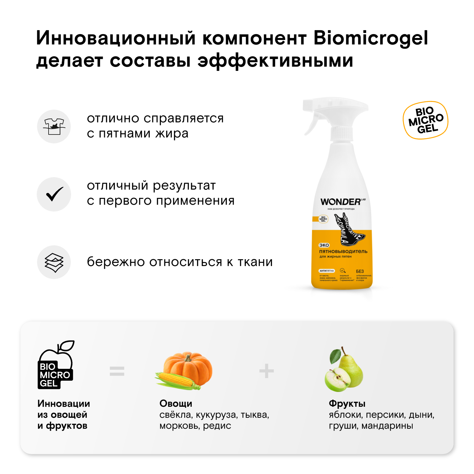 Вода > 30%, микрогели полисахаридов (Biomicrogel®) < 5%, анионный ПАВ < 5%, органический спирт < 5%, кислота лимонная < 5%, консервант < 5%.